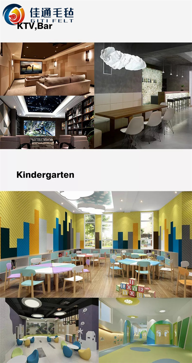 聚酯纖維吸音板有50多種顏色,可拼裝成各種圖案。 表面形狀有平面、方形(馬賽克)、寬條形、細(xì)條形等。該板可以彎曲成弧形。 可以使室內(nèi)人物設(shè)計(jì)更加靈活多變、效果顯著。 甚至可以通過電腦將藝術(shù)畫復(fù)制到聚酯纖維吸音板上。